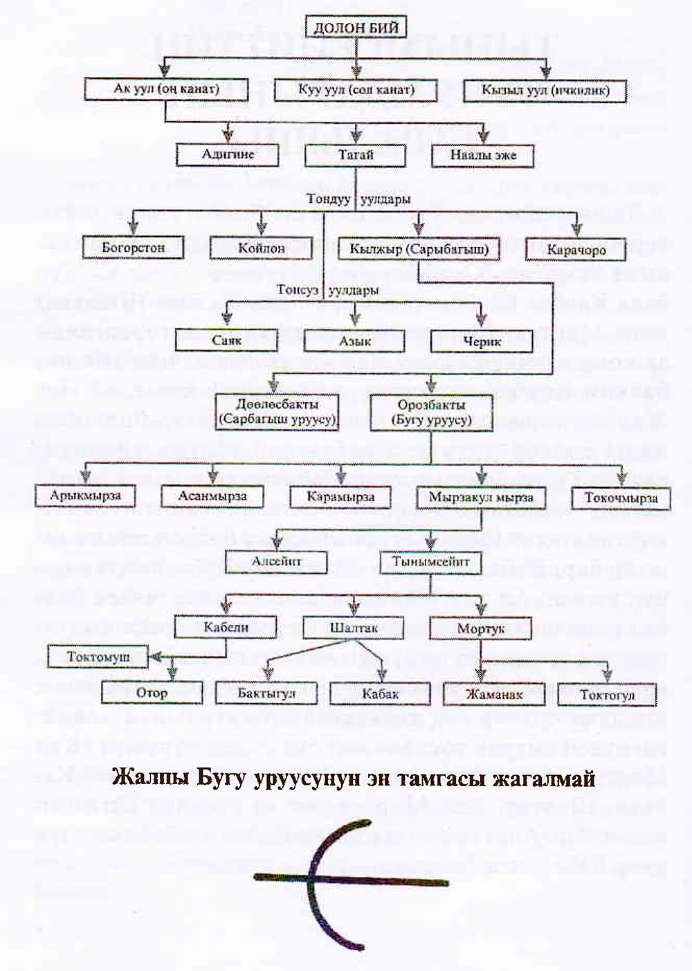 Үчүнчү уулу Тагайдын Кадимки чоң Сарбагыш Мойну кылжыр себептен Буруп айтып алган иш, Кылжырдан Орозбакты дейт Дөөлөс экөө бир тууган Бул экөөнүн уругу Кайчылашкан тең тууган Тынымсейит, Бугулар Орозбактан ушулар Маани жайы эң кызык Бул сөзүмдү угуп ал Чаласы калса Актандан Уламыштап угуп ал. Асан мырза Мырзакул Орозбактын балдары Арык деген бирөө бар Тукуму көп ал дагы, Асан мырза жаа атчу Абыдан адис мерген дейт Ала-Мышык тоосунан Кийик уулап жүргөн дейт Карагай чердин ичинен Бир кыз таап келген дейт Агасы Кара мырзага Никелеп алып берген дейт, Таап алган ал кыздын Башында мүйүзү болгон дейт Ал себептен Бугу деп Калктын атын койгон дейт Жалпы жонун айтабыз Тынымсеит, Бугу деп Эне наамын чакырган Нечен түрлүү уруу дейт. Кыздын аты Олуят Байбиче дейт карылар Актандан барып сурасаң Далай кызык табылаар, Башка түрүн мен айтсам Байбиченин шеги бар Ачыгын айтып жиберсем Аркырап Актан жулунаар.